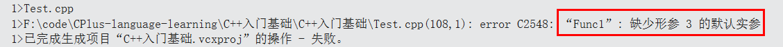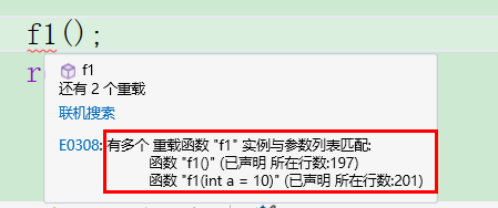 原因还是在于缺省参数能允许没有实参进行传递 ,这就会导致 f1(); 既能进入第一个f1函数也能进入第二个f1函数,编译器无法区别而导致报错。