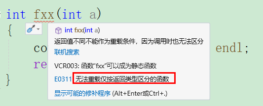 但是返回值的不同 是无法作为重载的条件,因为在函数调用时无法区分: