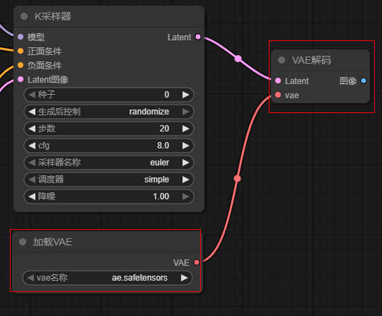 K采样器会输出 latent, 它需要一个AVE 解码节点进行解码,将其输出为图像。同样解码器还需要模型,所以再添加一个 VAE加载器