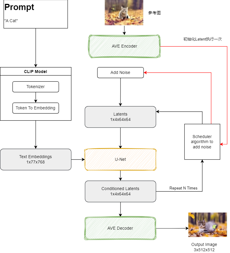 这个原理基本与文生图是一样的,只不过是添加参考图的时候,多了使用 AVE Encoder 将参考图向量化,然后调度器加入了高斯噪点后放入了 Latents Space. 而文生图则使用的是Emptyt Latents Space.