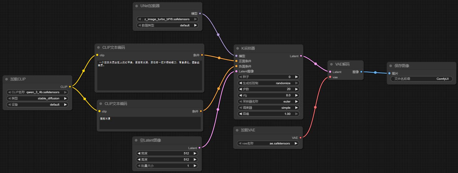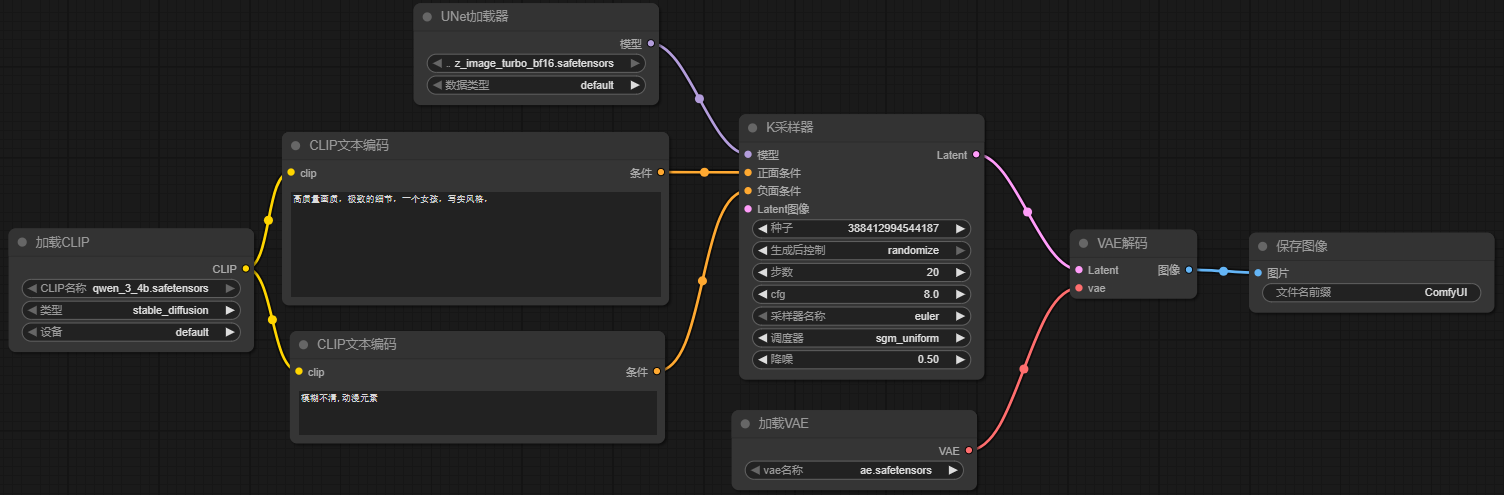 U-NET中采用的模型。即K采样器中所使用的模型。如果这个模型在预训练的时候采用的数据集是动漫二次元风格,那么它最终生成的图就是动漫二次元风格。如果是写实的,那它生成的就是写实的。而本次所使用的模型是Z-Image在风格支持方面还是比较全面的。所以风格方面,你得靠提示词去做一些优化。 - Latent 限制了图片的大小. 它配置了大小后,就会添加噪点,然后交给 U-Net 来进行降噪。U-Net降噪的同时,会结合 CLIP文本特征向量,一遍一遍的降噪,最终生成图片。