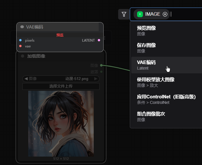 因为参考图要被向量化,所以要添加AVE编码节点。直接在"加载图像" 节点上的 "图像"(蓝色圆点)上用鼠标拖拽出连线然后释放鼠标,就弹出界面,然后选择 VAE编码即可