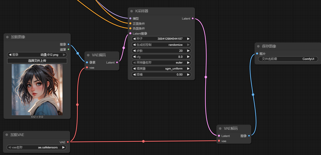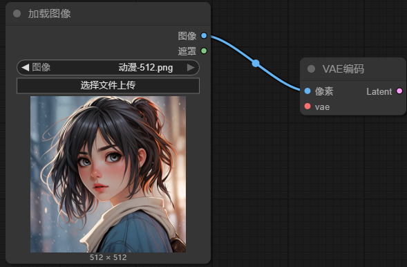 Latent连接到K采样器的Latent图像,它输出的Latent要交给K采样器来与 提示词合成新图。 - VAE编码节点要将参考图向量化,需要模型,所以要与