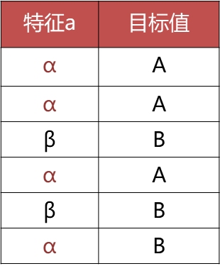 对于以下数据,已知6个样本,根据特征a:α 部分对应的目标值为: AAAB,β 部分对应的目标值为:BB