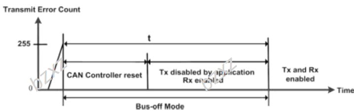 Bus Off为ECU总线通讯关闭,ECU进入Bus Off故障后报文发送被禁止。通过访问CAN控制器状态识别Bus Off错误,当ECU检测到Bus Off错误后,需进行Bus Off恢复计时,并且CAN控制器要立即执行初始化。