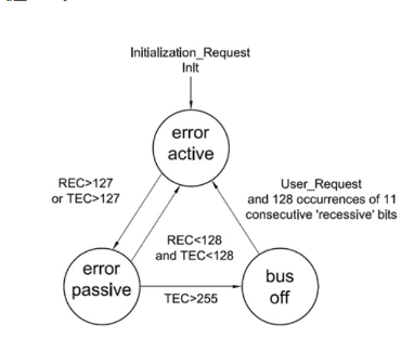 根据错误计数器值,节点可以分为主动错误状态,被动错误状态以及Busoff发生状态三种。