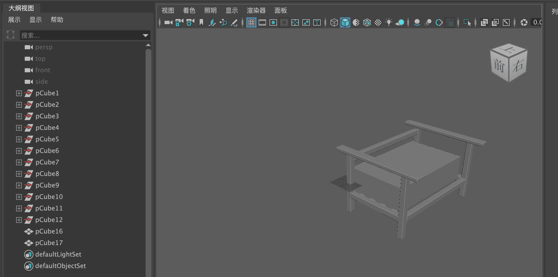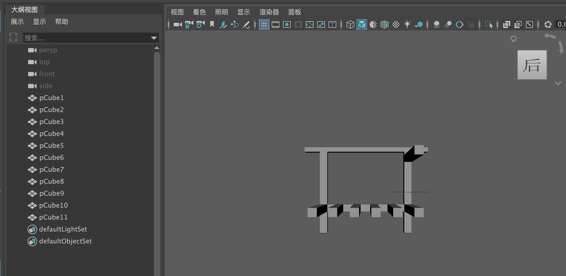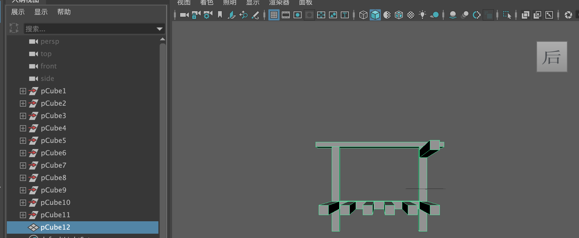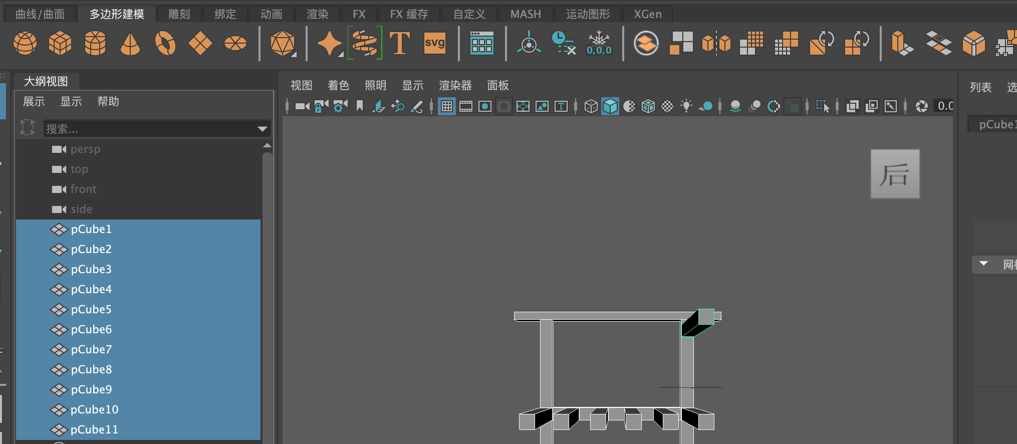 (8)将场景中的所有长方体模型一起选中,单击"多边形建模"工具架上的"结合"图标,将其合并为一个整体模型