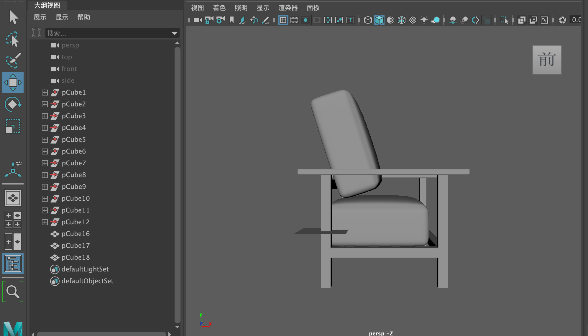 (17)使用"缩放工具"和"移动工具"在"前视图"中微调沙发靠背模型