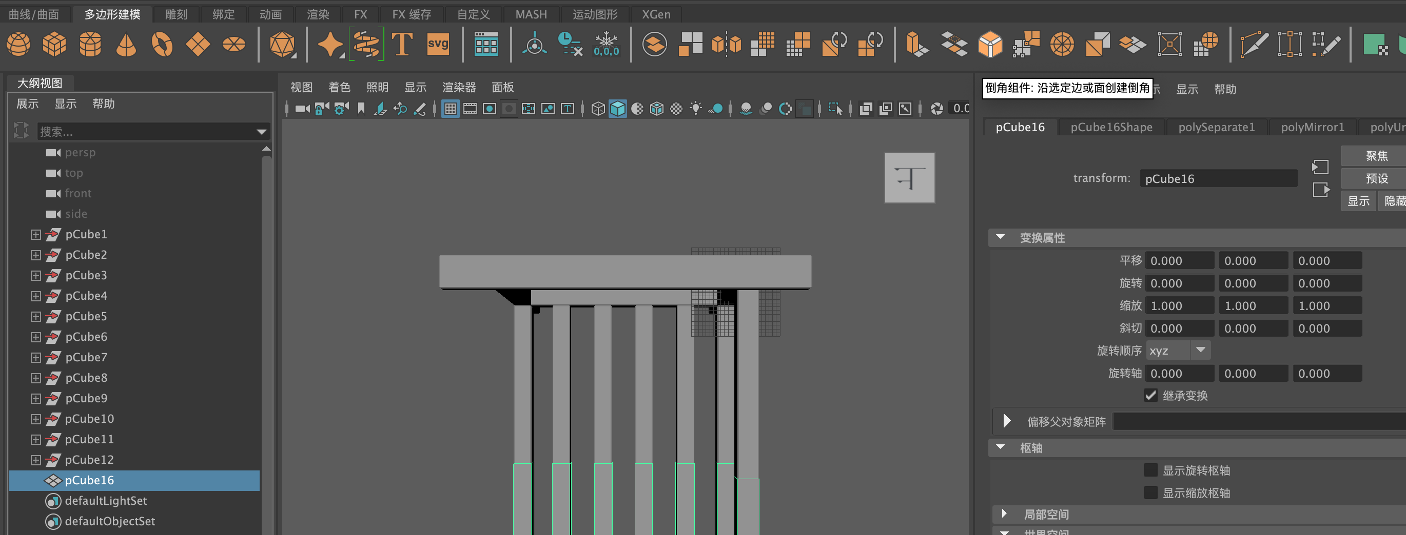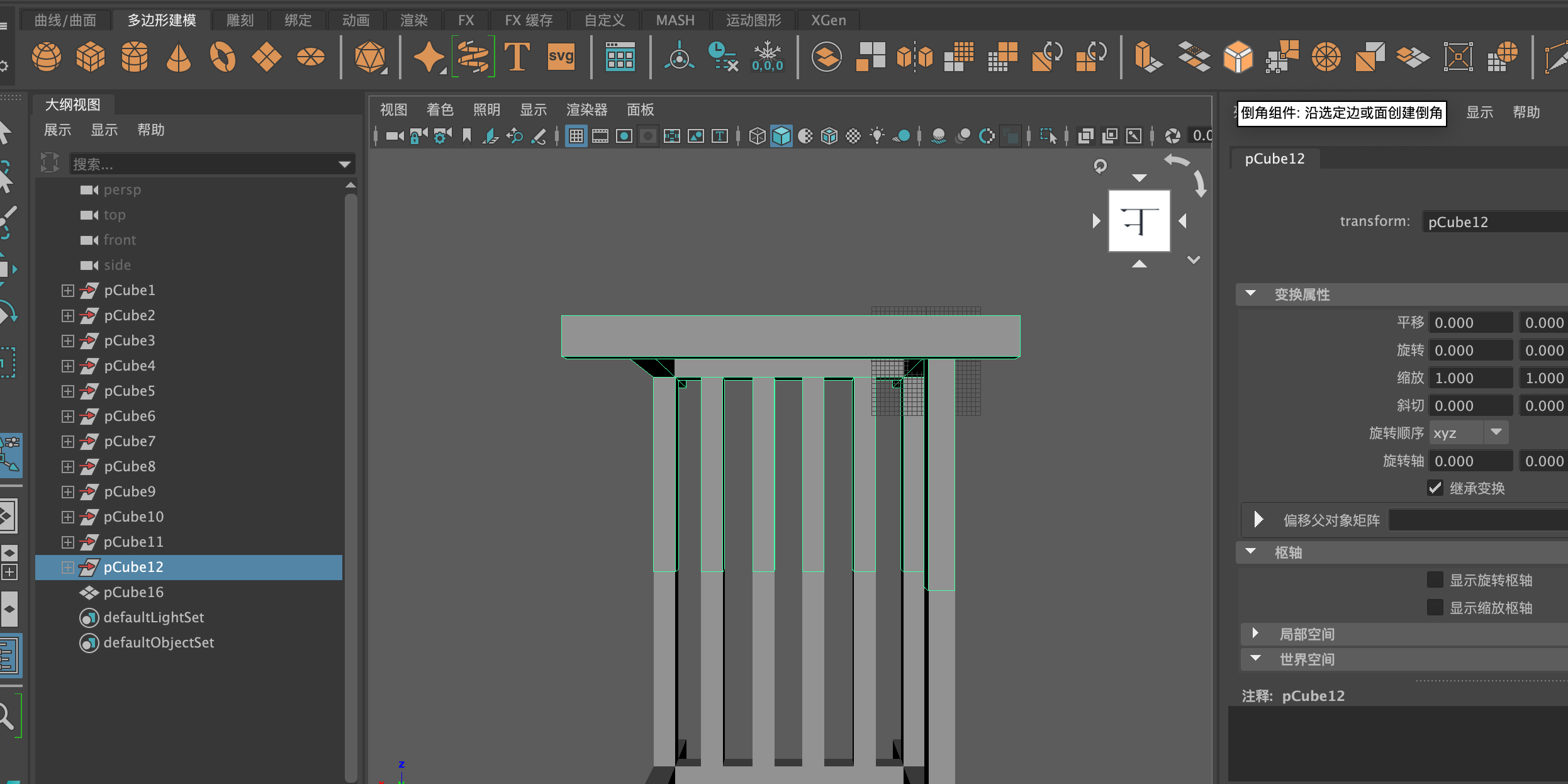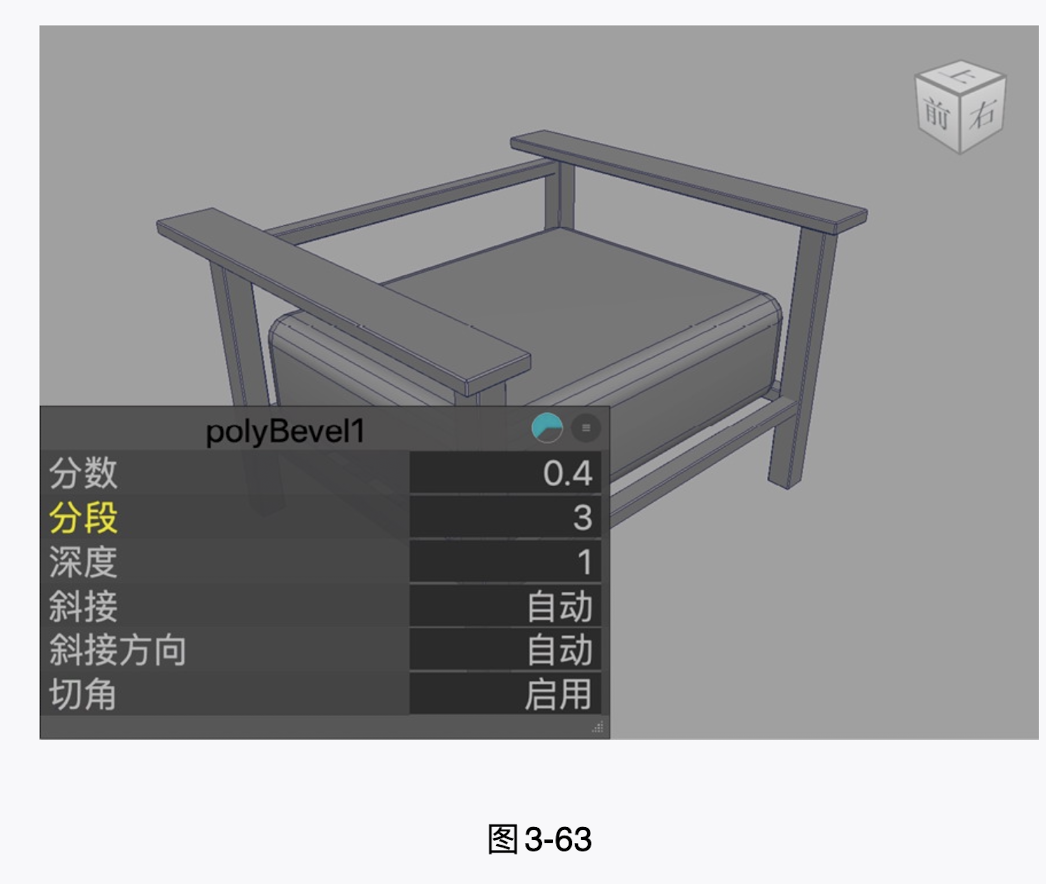 (13)单击"多边形建模"工具架上的"倒角组件"图标,如图3-63所示,制作出模型的倒角效果