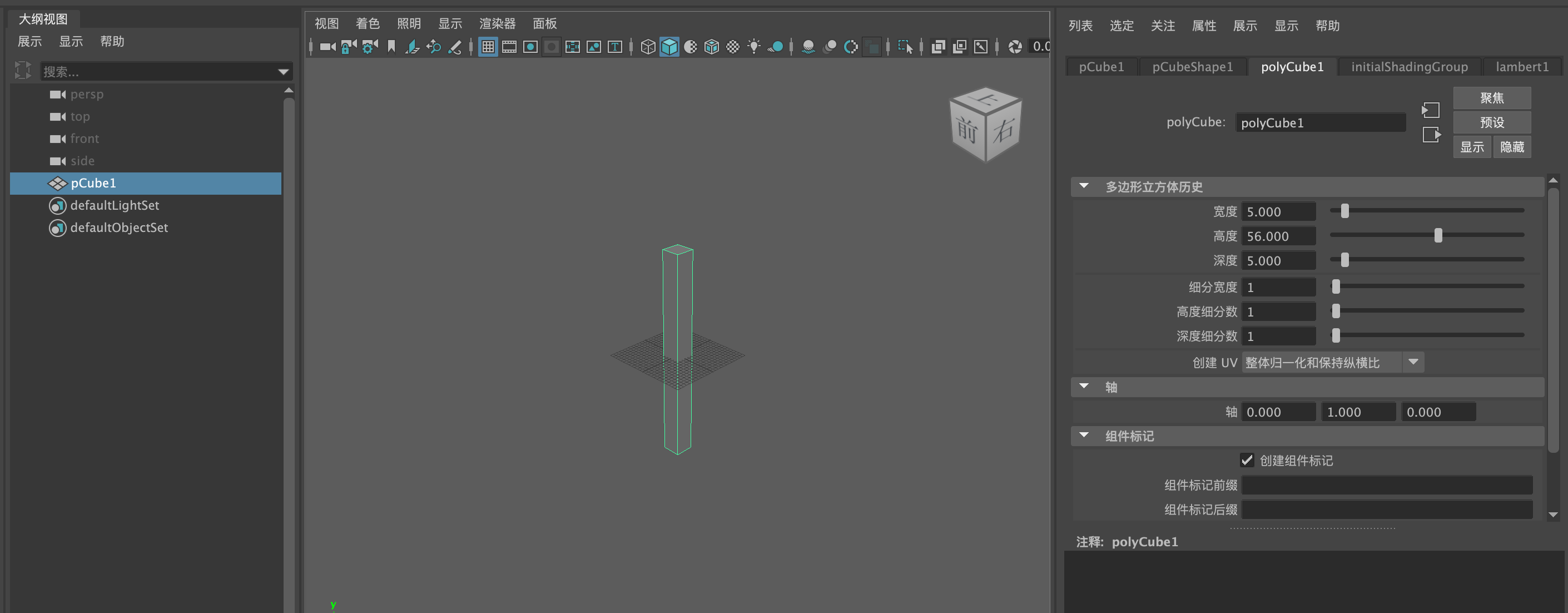 (1)启动中文版Maya 2024软件,单击"多边形建模"工具架上的"多边形立方体"图标,在场景中创建一个长方体模型。(2)在"多边形立方体历史"卷展栏中,设置"宽度"为5,"高度"为56,"深度"为5