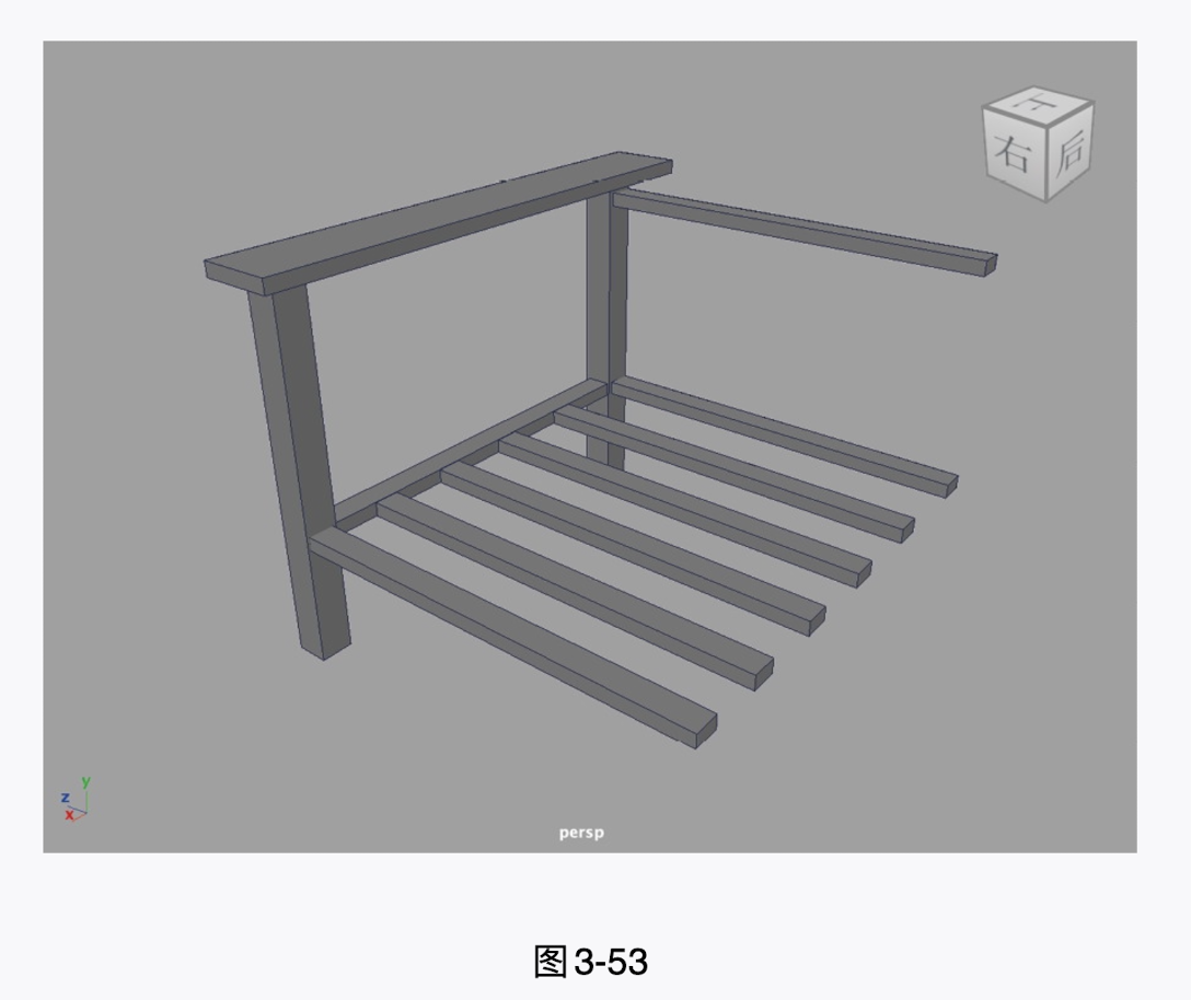 (7)重复以上操作,制作出整个沙发模型一侧的木制支撑结构,如图3-53所示。