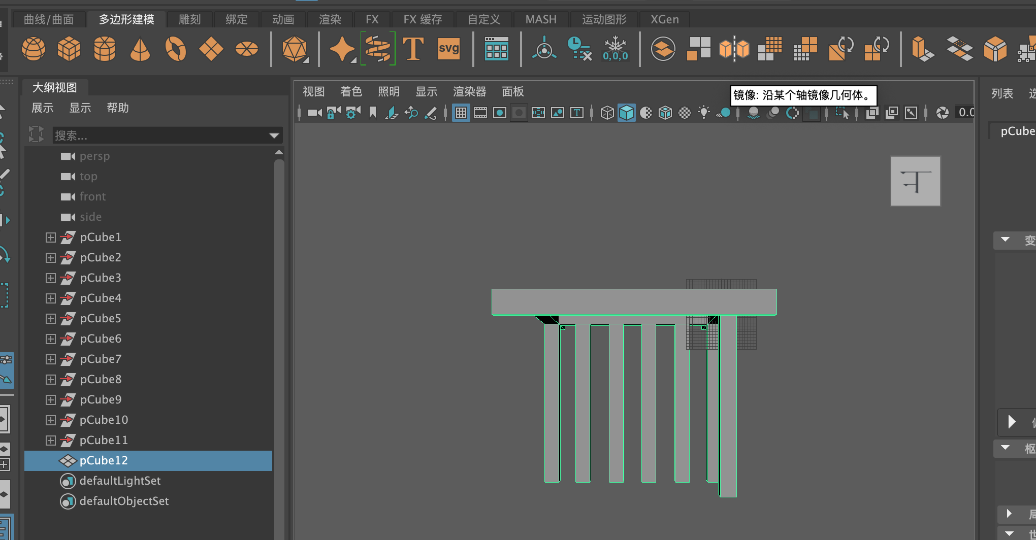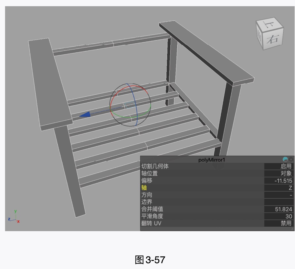 9)单击"多边形建模"工具架上的"镜像"图标,如图3-56所示,制作出沙发腿的另一侧结构,如图3-57所示。