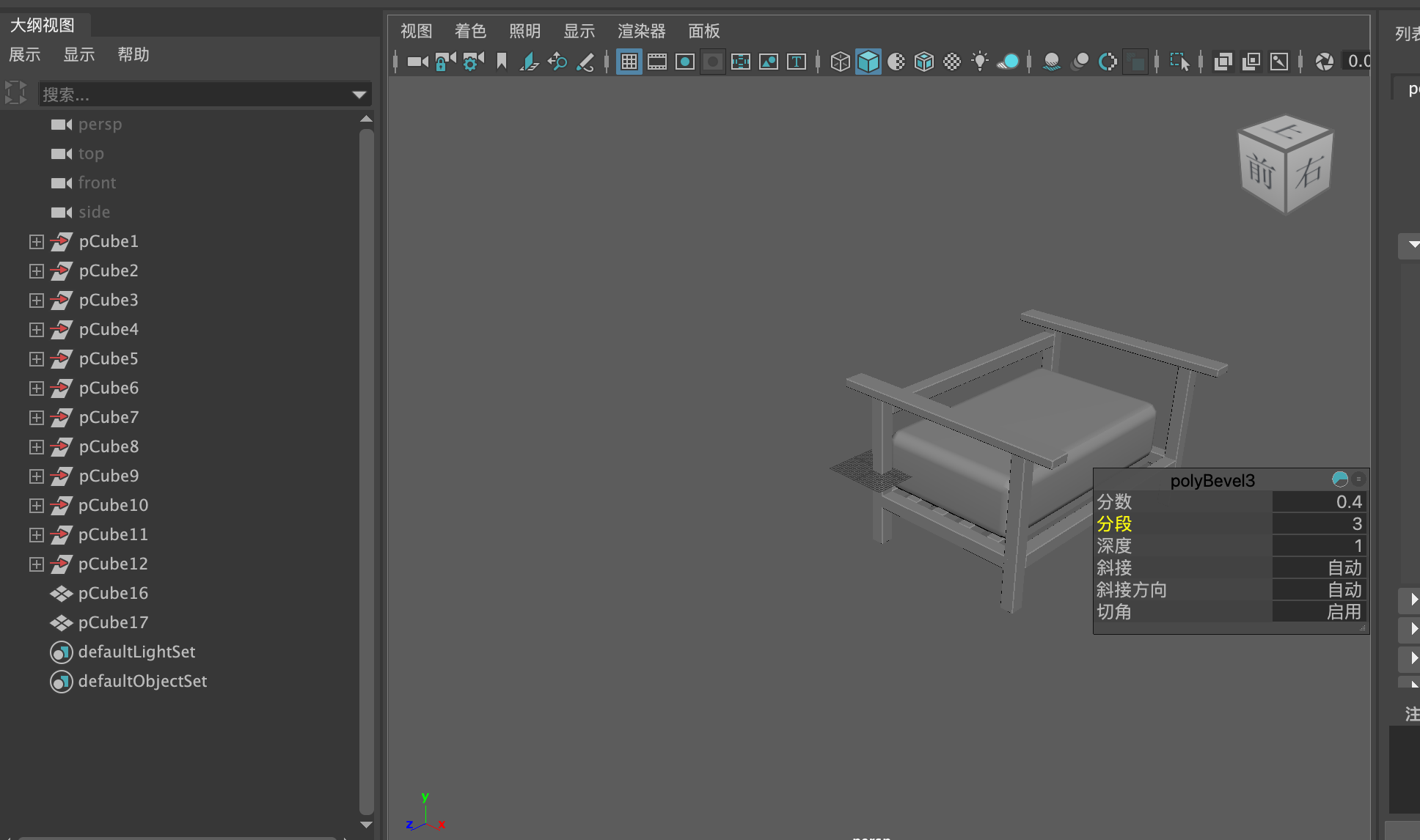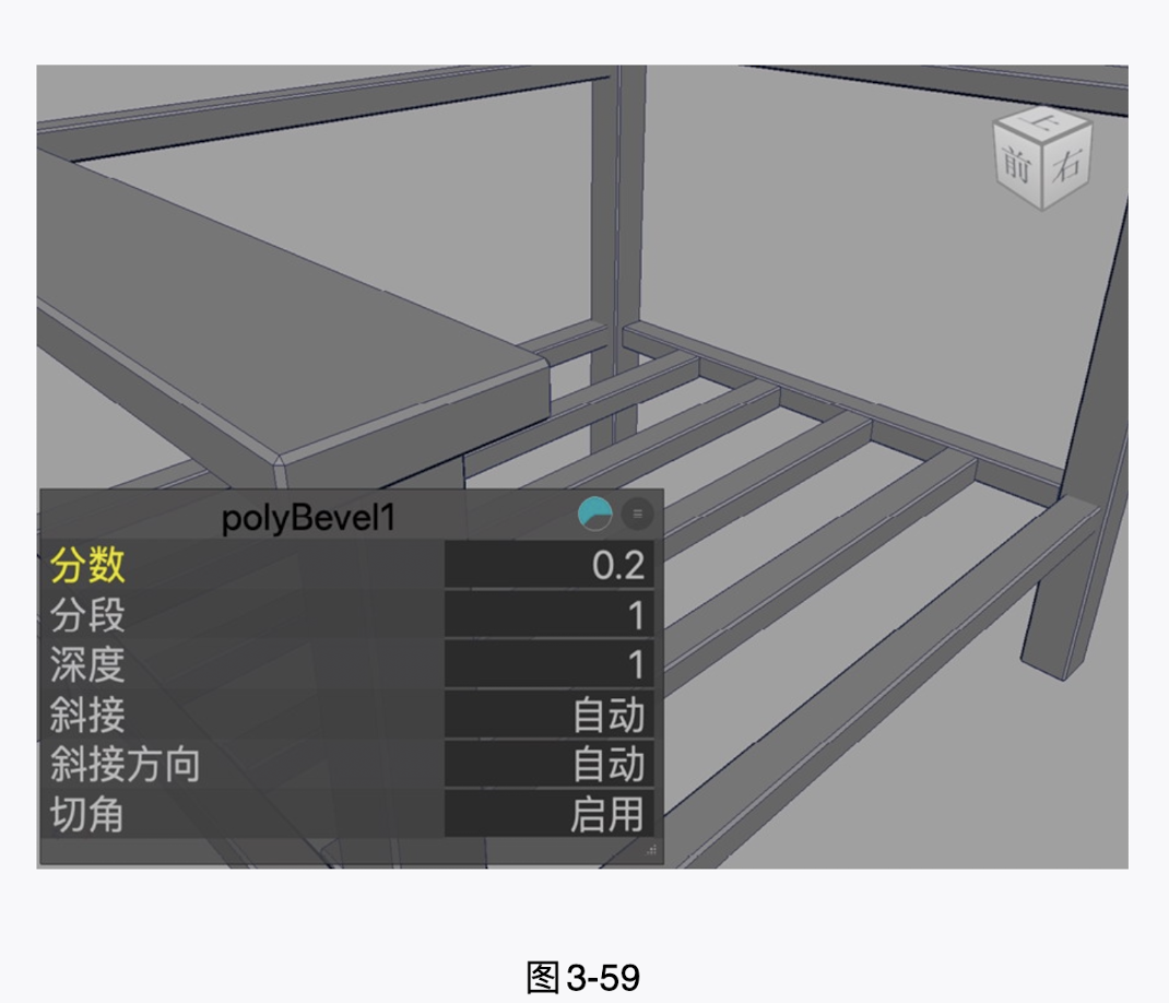 (10)单击"多边形建模"工具架上的"倒角组件"图标,制作出模型的倒角效果,如图3-59所示。