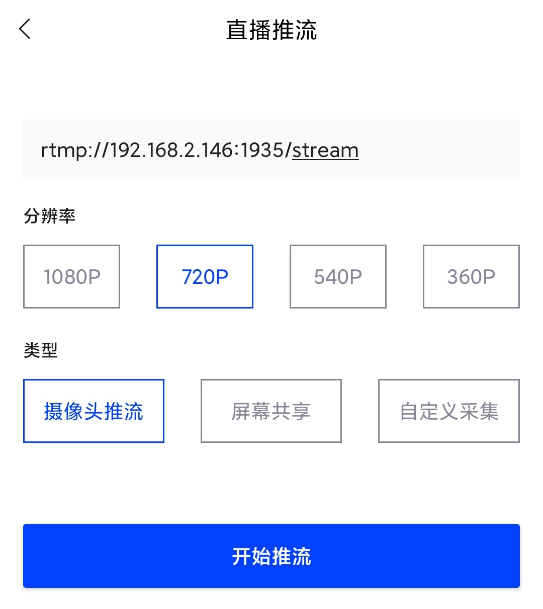可见anyRTC既支持向服务器推流,也支持从服务器拉流。那么准备两部安卓手机,一部用于推流,另一部用于拉流。用于推流的手机点击App界面上的【直播推流】区域,打开推流页面如下图所示: