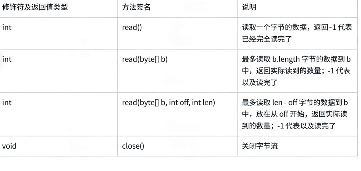 InputStream 只是一个抽象类,要使用还需要具体的实现类。关于InputStream的实现类有很多,基本可以认为不同的输入设备都可以对应一个InputStream类,我们现在只关心从文件中读取,所以使用FileInputStream