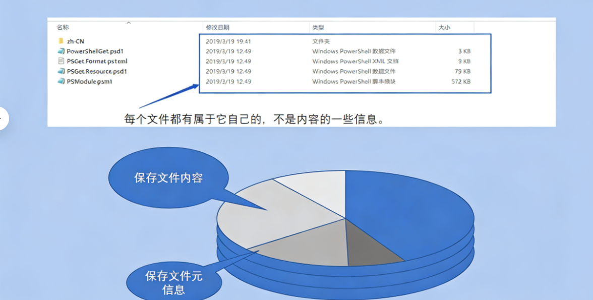 文件除了有数据内容之外,还有⼀部分信息,例如文件名、文件类型、文件大小等并不作为文件的数据而存在,我们把这部分信息可以视为⽂件的元信息。