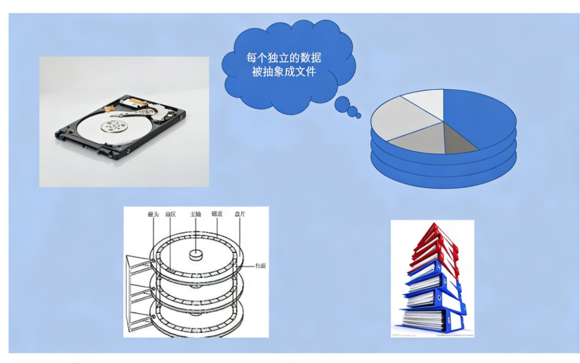 我们先来认识狭义上的文件(file)。针对硬盘这种持久化存储的I/O设备,当我们想要进行数据保存时, 往往不是保存成⼀个整体,而是独立成⼀个个的单位进行保存,这个独立的单位就被抽象成文件的概念,就类似办公桌上的⼀份份真实的文件⼀般。