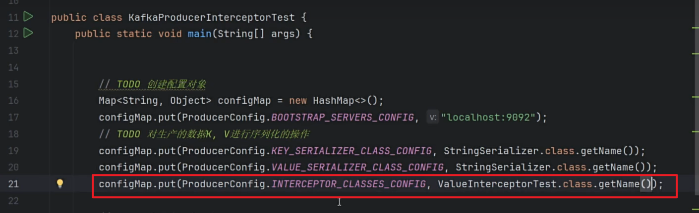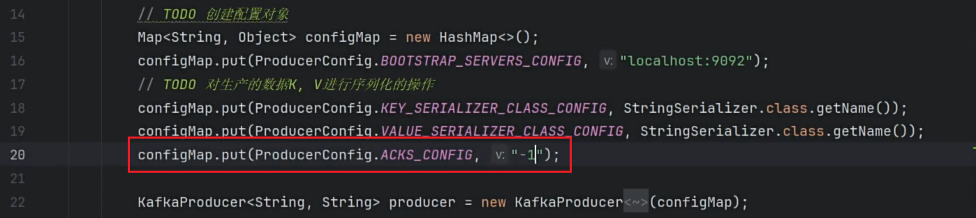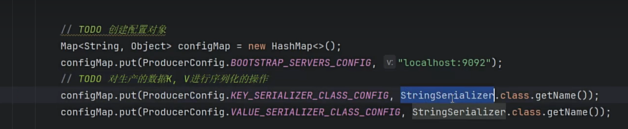 - 创建配置对象,连接Kafka集群,对生产的数据进行序列化操作