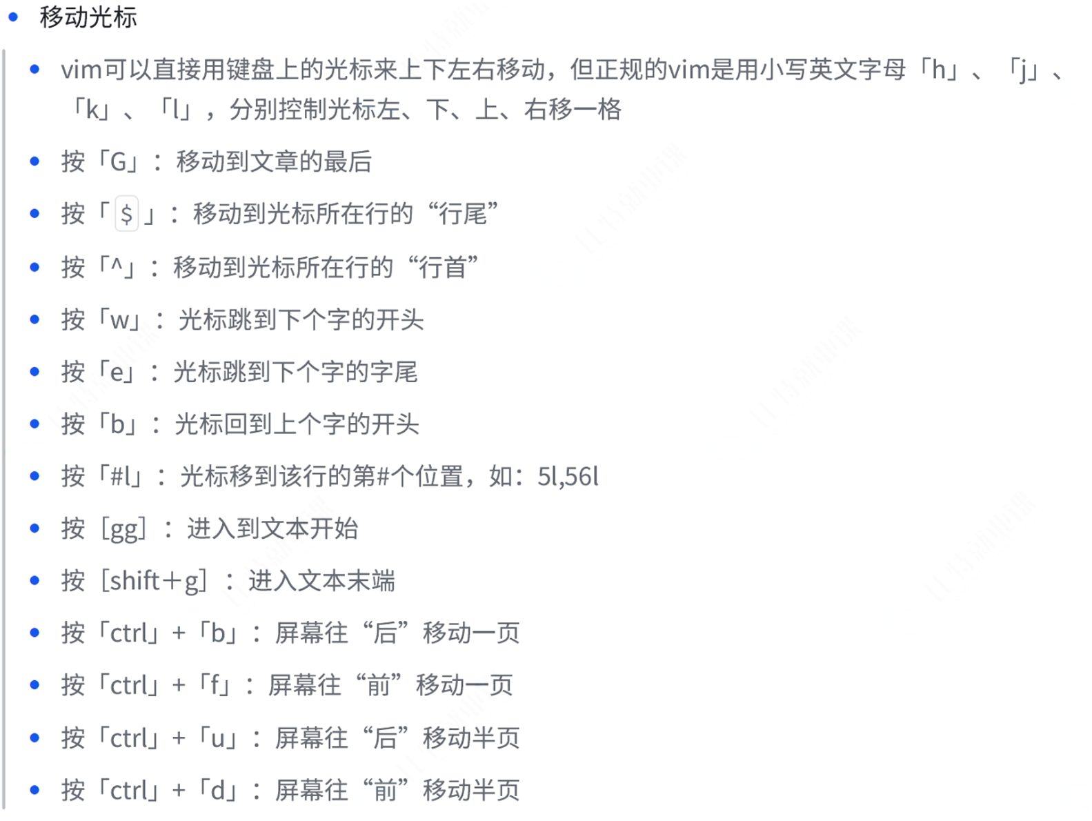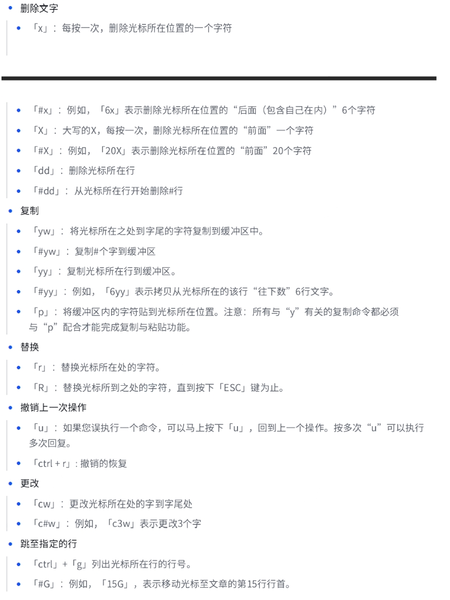 控制屏幕光标的移动,字符、字或行的删除,移动复制某区段及进入Insert mode下,或者到 last