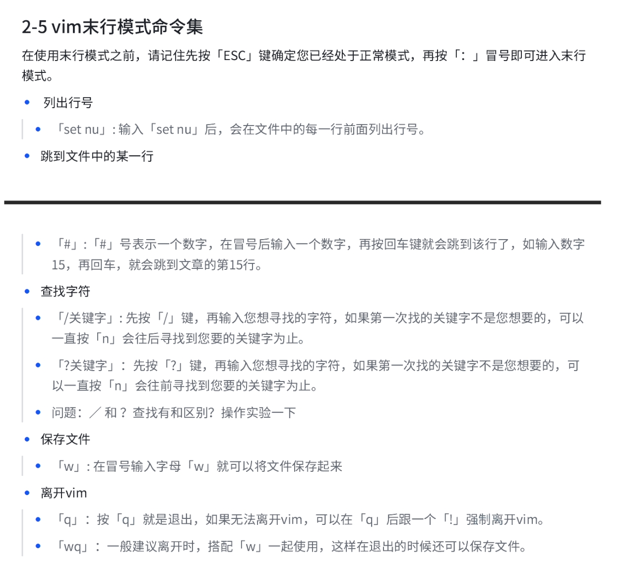 • 退出vim及保存文件,在[正常模式]下,按一下「:」冒号键进入「Last line mode」,例如: