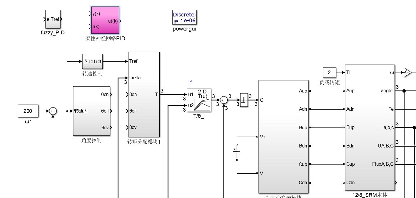 开关磁阻电机控制仿真(matlab 2016b版本仿真模型 自用) 模型包涵: 开关磁阻电机传统控制:电流斩波控制、电压PWM控制、角度位置控制。 智能控制:12/8三相开关磁阻电机有限元分析本体建模、转矩分配函数控制、模糊PID控制、模糊角度控制、神经网络在线自适应迭代控制。 部分离线迭代算法:遗传算法优化PID、粒子群算法优化PID。 毕业研究生自用仿真模型 .