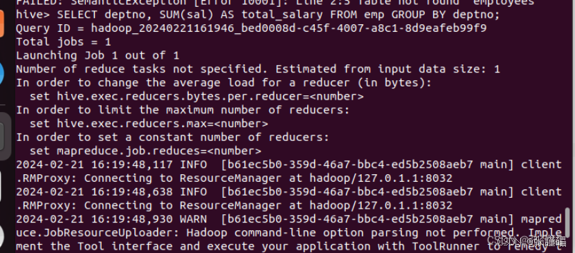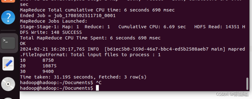| 7934 | MILLER | CLERK | 7782 | 1982/1/23 | 1300 | | 10 |LOAD DATA INPATH '/ussr/local/input/emp.csv' INTO TABLE emp;