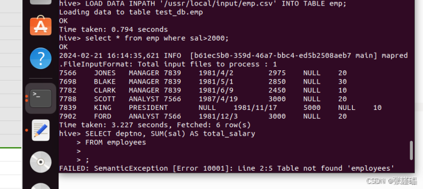 1.将emp.csv中的数据导入到emp表中emp.csv表如下(要提前上传到hdfs上)