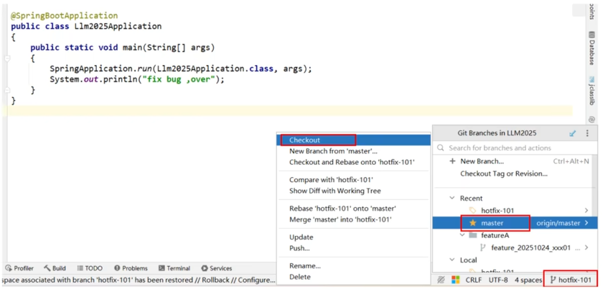 5 修复完成后,切换到master分支并完成合并,最后删除刚才的bug分支