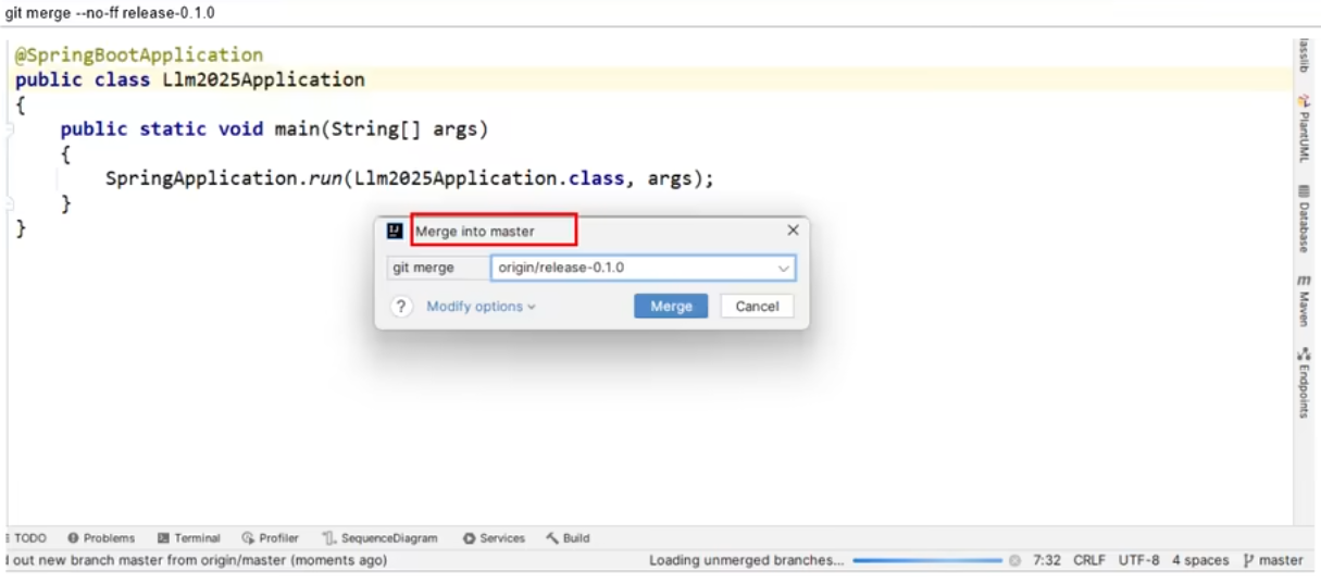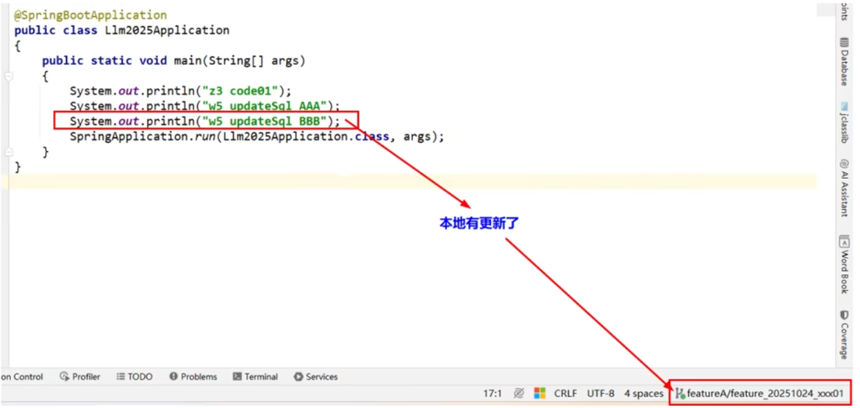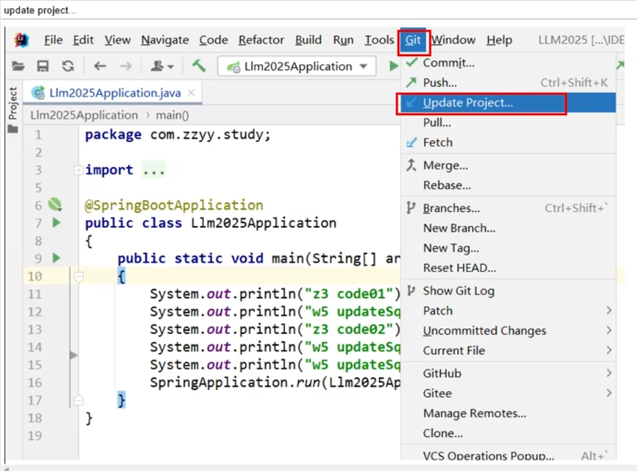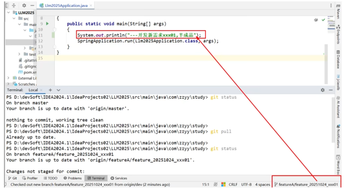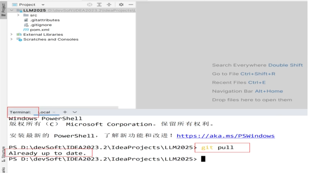 启动IDEA工具打开上一步clone下来的项目并进入命令终端模式,再用 git pull