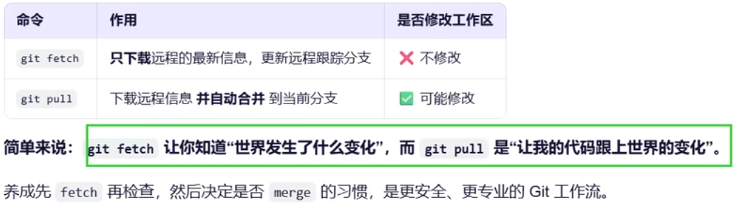 作用:从远程仓库下载最新的元数据和对象(如提交、分支、标签),但不会修改你本地的工作目录或当前分支,仅仅是安全地查看远程变化情况