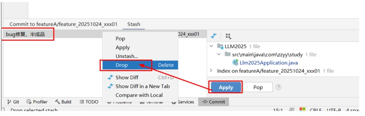 ① 用git stash apply恢复,但是恢复后,stash内容并不删除,你需要用git stash drop来删除