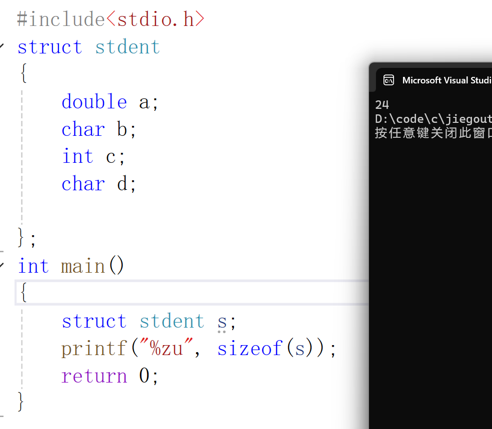 结构体的内存对齐:结构体在上面的基础上又多了一条,结构体的总大小,是最大类型的整数倍(用来确定最后一个数据补位的情况)