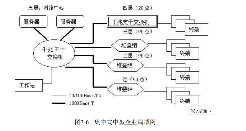 集中式中型企业局域网 :所有部门在同一建筑内,采用5类双绞线布线,两层结构(网络中心和楼层设备间)