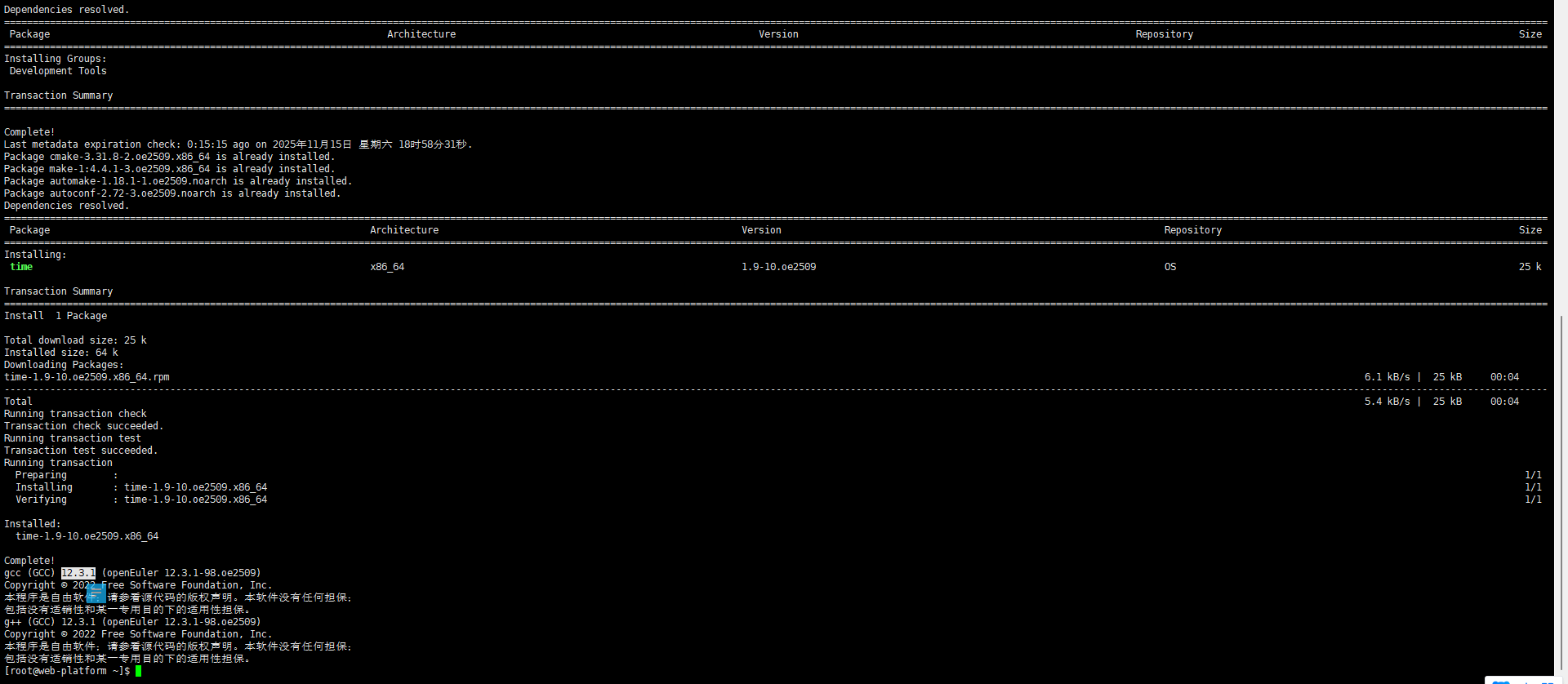 输出显示当前使用的是GCC 12.3.1版本,这是openEuler默认提供的稳定编译器版本。