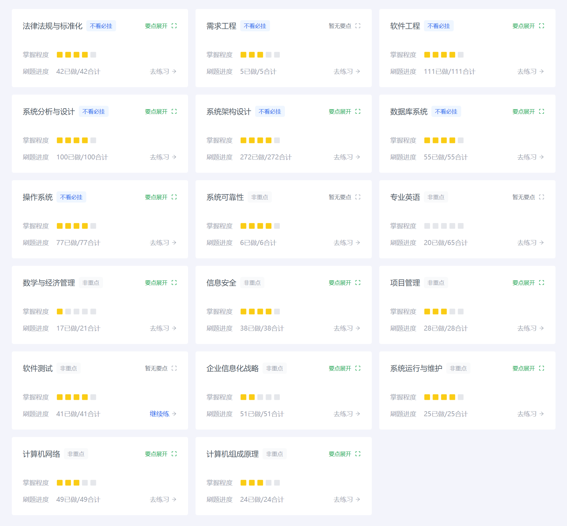 整体来说就是看视频+看红宝书+做题,这里的刷真题非常重要,它可以快速了解到某个知识点实际会怎么考察,我印象最深刻的点在于,有的科目例如数据库它的知识点很抽象但是题目很简单,也有科目恰好相反。另外,一开始刷题可以开卷刷,毕竟上来第一个重点科目软件工程全是记忆内容(苦笑),容易打击积极性。