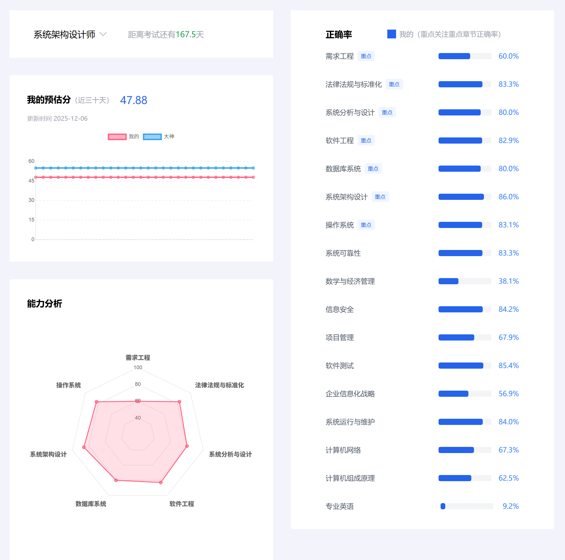 错题我就没有再刷了,因为很多都是超纲题,那种题目记了意义也不大,根本考不到重复的。最终数据面板如下: