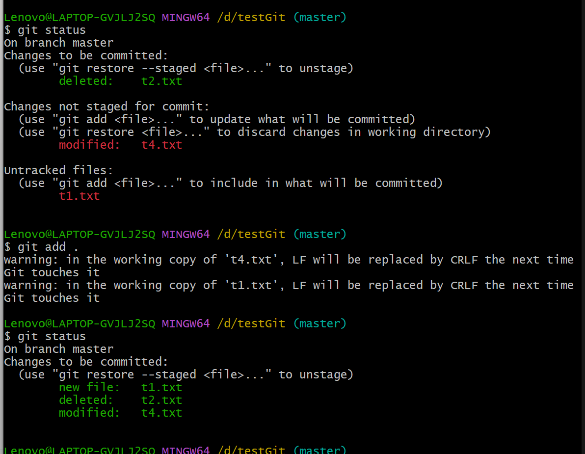 git add . 提交新文件(new)和被修改(modified)文件,不包括被删除(deleted)文件