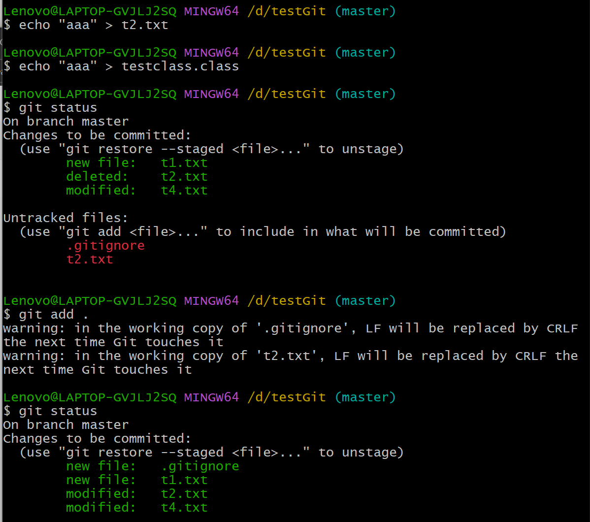 创建两个文件,查看状态我们发现testclass.class不在工作区,提交也不会进入暂存区