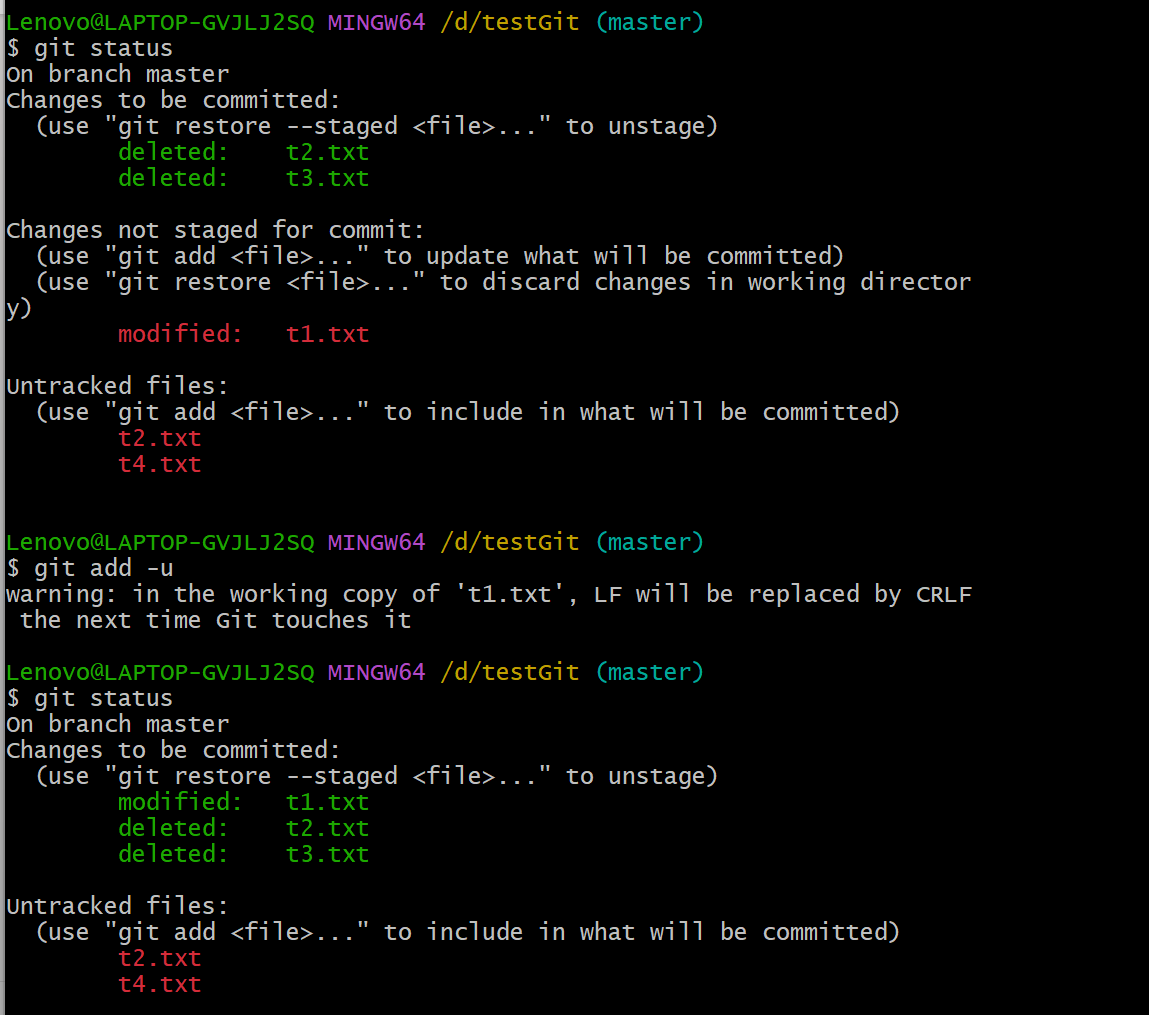 git add -u 提交被修改(modified)和被删除(deleted)文件,不包括新文件(new)