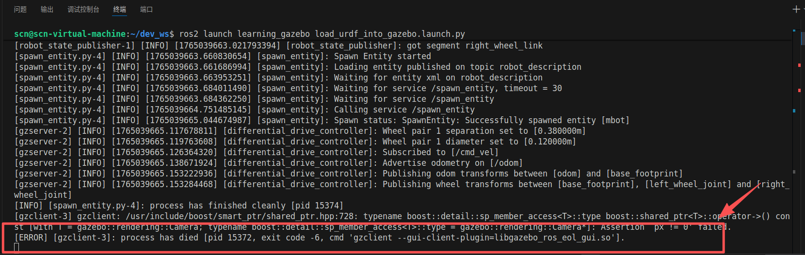 [gzclient-3] gzclient: /usr/include/boost/smart_ptr/shared_ptr.hpp:728: typename boost::detail::sp_member_access<T>::type boost::shared_ptr<T>::operator->() const [with T = gazebo::rendering::Camera; typename boost::detail::sp_member_access<T>::type = gazebo::rendering::Camera*]: Assertion `px != 0' failed.