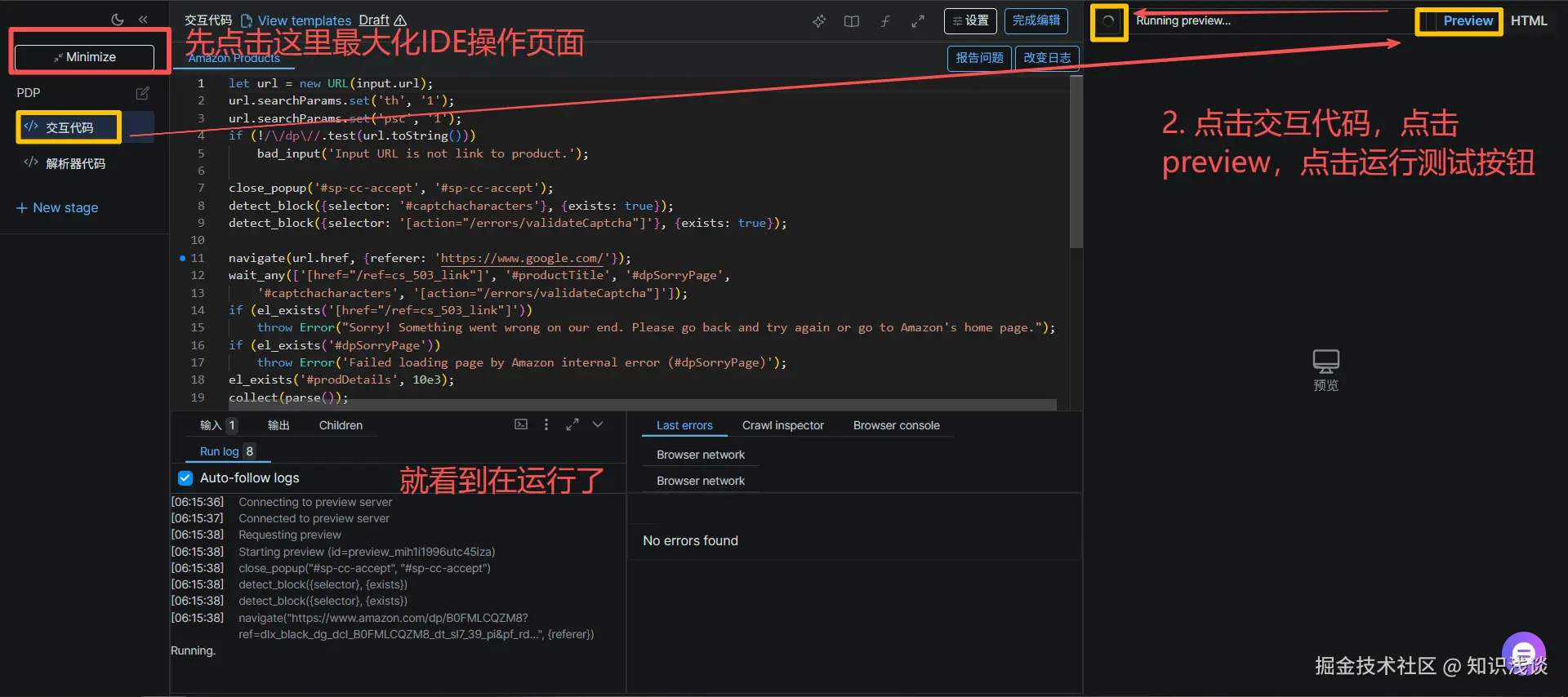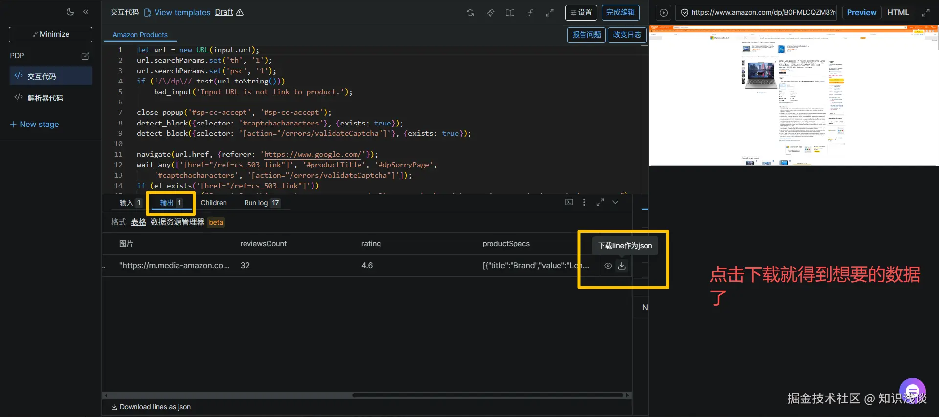 完成后,界面会直接跳转到爬虫的预览和测试页面 。你可以立即看到AI帮我们写好的代码,点击交互代码-->点击preview-->点击运行测试按钮然后 就看到程序在运行了