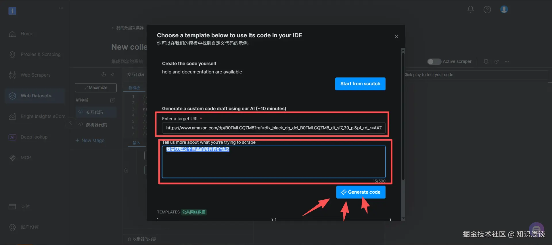 点击"Generate code"按钮后,AI引擎开始工作。它会自动分析目标网页的结构,理解你的自然语言指令,并在后台生成完整的爬虫代码。这个过程通常只需要1-10分钟,而以往这可能需要一个开发者数小时的工作。