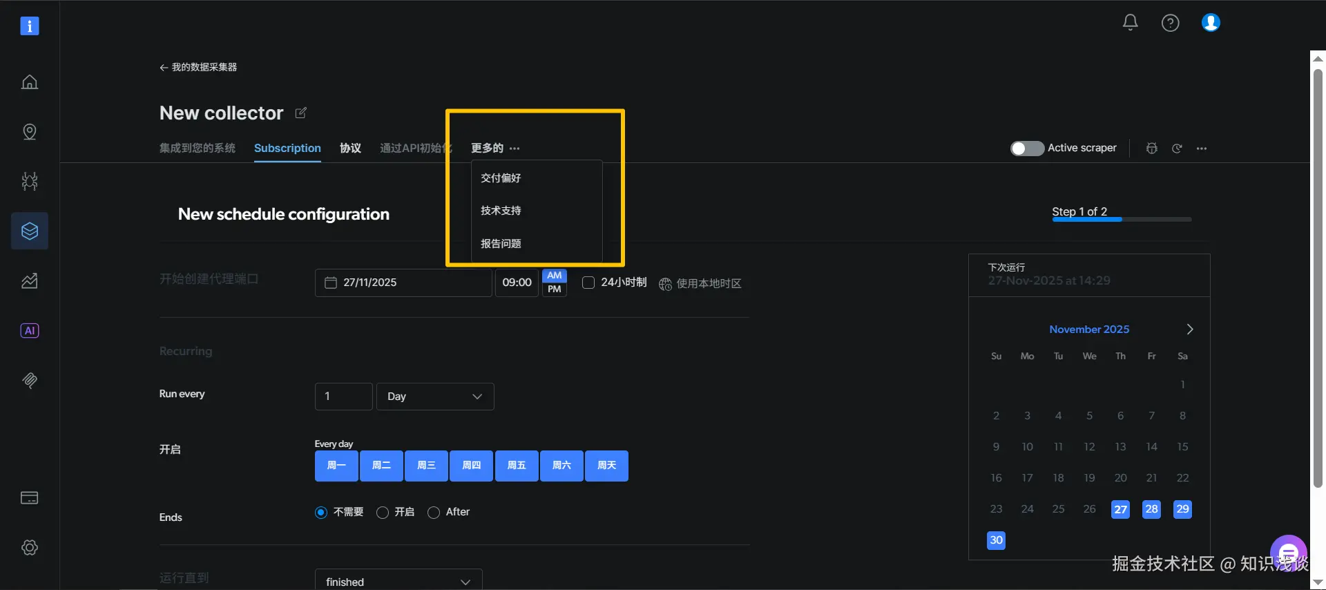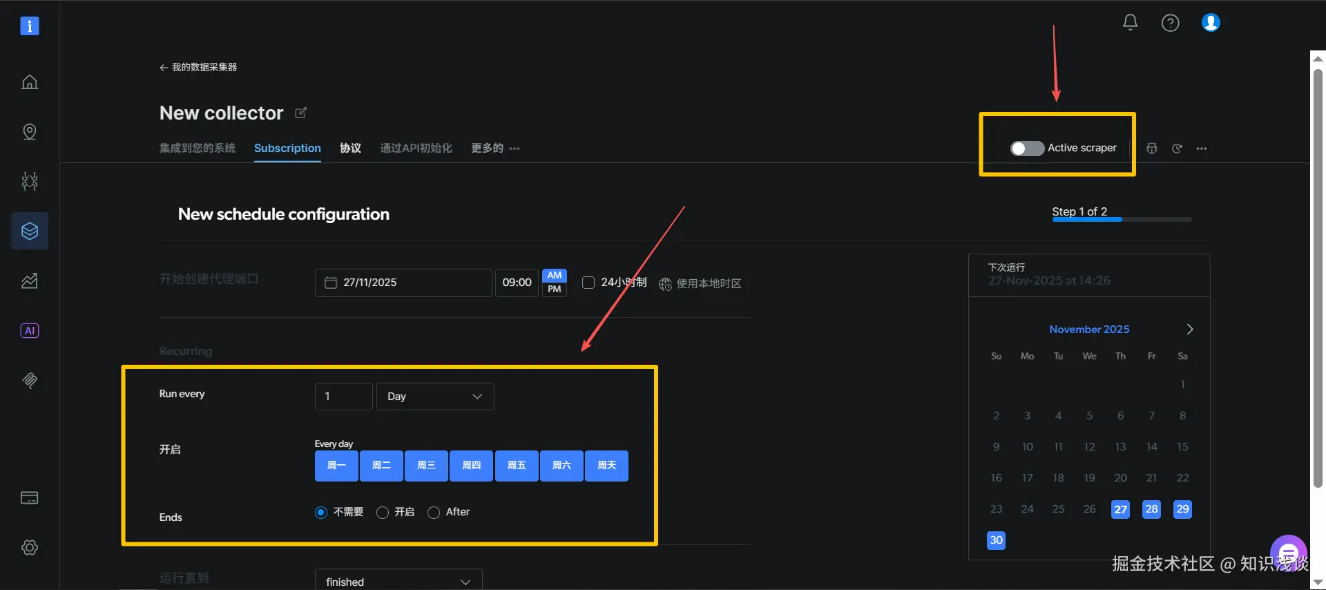 现在,这个爬虫就已经部署在Bright Data的云端平台上了。你可以设置定时按照你想要的时间定时运行 ,采集任何你想要的数据,只需要点击Subscription,然后设置定时任务的规则,最后点击Active scraper,激活定时任务,最后生成的数据都会在输出结果中保存。