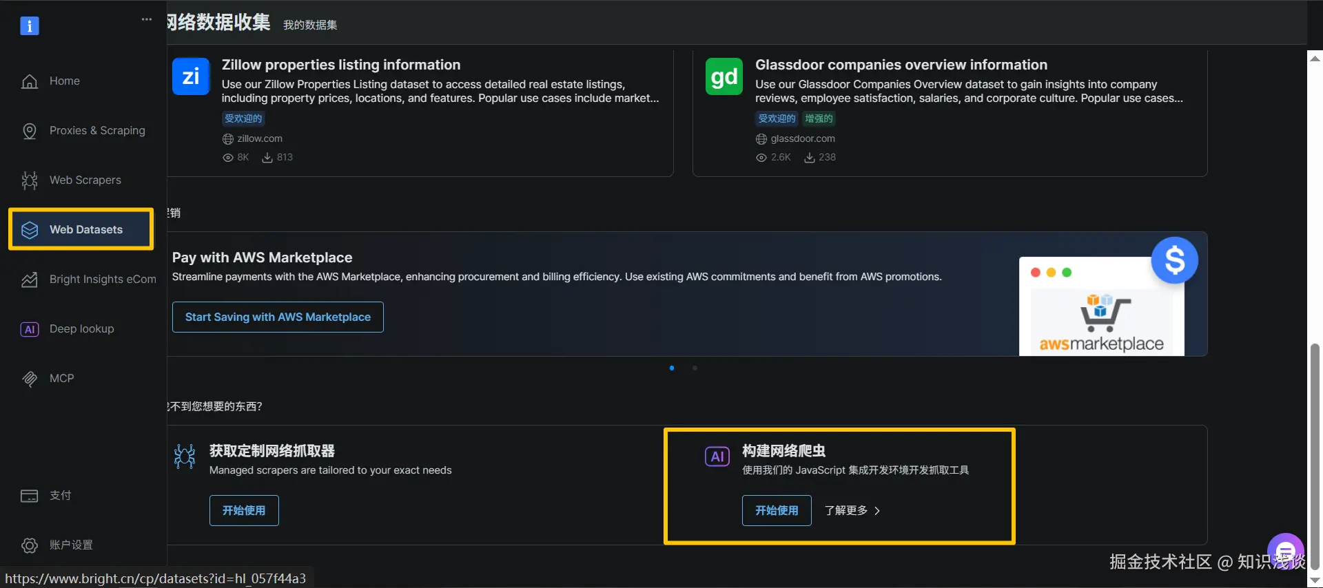 登录Bright Data控制台。如果你读过《亮数据(Bright Data)Web Scraper爬虫》,你会对这个界面感到熟悉。在左侧菜单栏找到 "Web Datasets" 并点击进入。