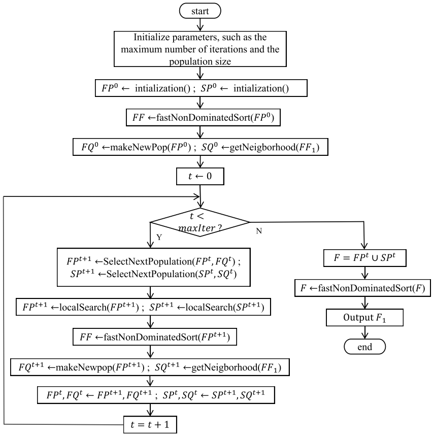 为更充分利用精英解,本文提出了双种群策略。算法在初始化时创建两个种群:种群 1(主种群):通过交叉与变异正常进化;种群 2(辅助种群):不进行交叉变异,而是依据种群 1 的帕累托前沿生成邻域解。种群 2 对种群 1 的每个非支配解生成一个邻域个体,并按需重复,直到达到预设规模。种群 2 仅在帕累托前沿附近进行局部精细搜索,不影响种群 1 的多样性,却能提升寻找更优解的能力。
