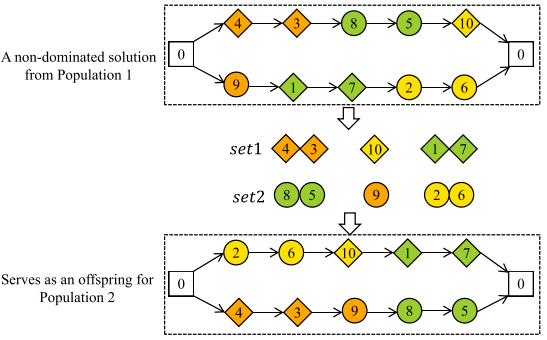 为获得既多样又高质量的初始种群,本文设计了两种互补的初始化方法:方法 1(增加多样性):随机排列所有受灾点,并在卡车与无人机的载重和航程限制下逐点分配形成子路径;超限则开启新的车辆与路线。该方法种群多样性高但质量不稳定。方法 2(提高质量):先随机排序无路障受灾点,再将每个有路障受灾点插入到距离最近的无路障点后,以减少无人机飞行距离。随后按方法 1 的规则生成路线,能得到更高质量的初始化种群。