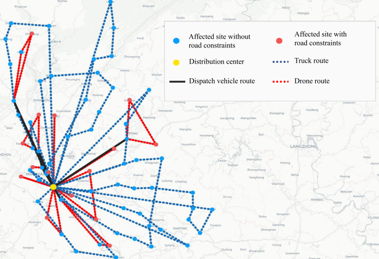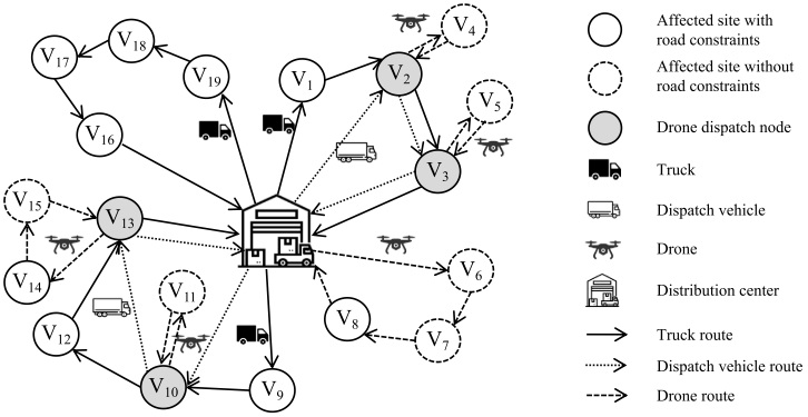 VRPDD 是一种基于卡车--无人机--调度车辆协同作业的应急物资配送模型,模型将配送区域表示为有向图,其中受灾点根据可达性分为:无路障点(可由卡车或无人机服务),有路障点(只能由无人机服务)。配送模式包括三类:卡车独立配送,无人机独立配送,卡车--无人机--调度车辆联合配送。联合配送用于服务超出无人机航程或卡车无法到达的受灾点,可提高应急场景下的可达性与效率。