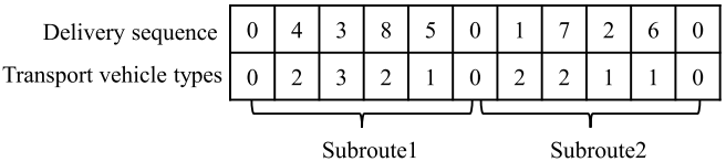 本文采用二维表编码方式,第一行表示受灾点的配送顺序,其中 0 为配送中心;第二行表示各受灾点的运输方式:1:卡车服务,2:无人机服务,3:卡车在该点执行无人机起降的联合服务。