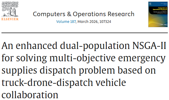 1\] Guo Q, Qiu Y, Shi Y, et al. An enhanced dual-population NSGA-II for solving multi-objective emergency supplies dispatch problem based on truck-drone-dispatch vehicle collaboration\[J\]. Computers \& Operations Research, 2025: 107324. ### 6.代码获取 xx ### 7.算法辅导·应用定制·读者交流 xx## 标题