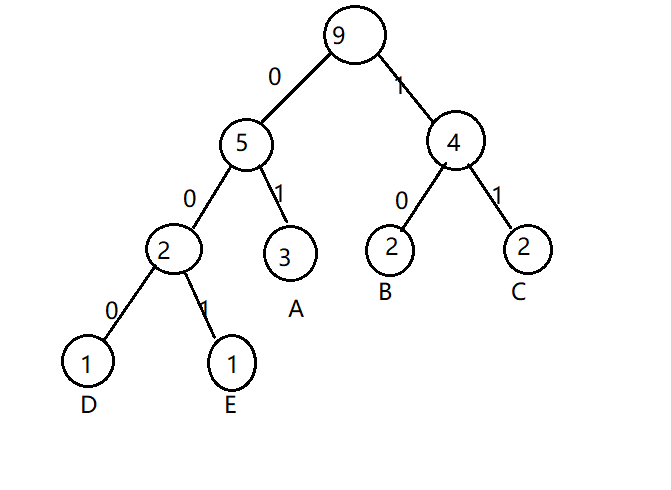 选择最小的A和DE结合节点,最后和BC的结合节点合并,左边填充0,右边填充1,最终完整的哈夫曼树如下